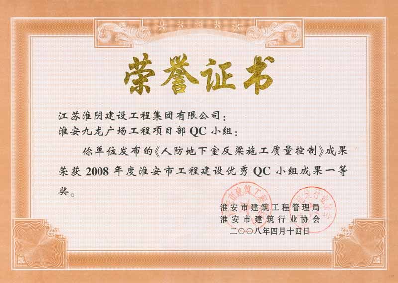 2008年市级QC一等奖(淮安九龙广场-人防地下室反梁施工质