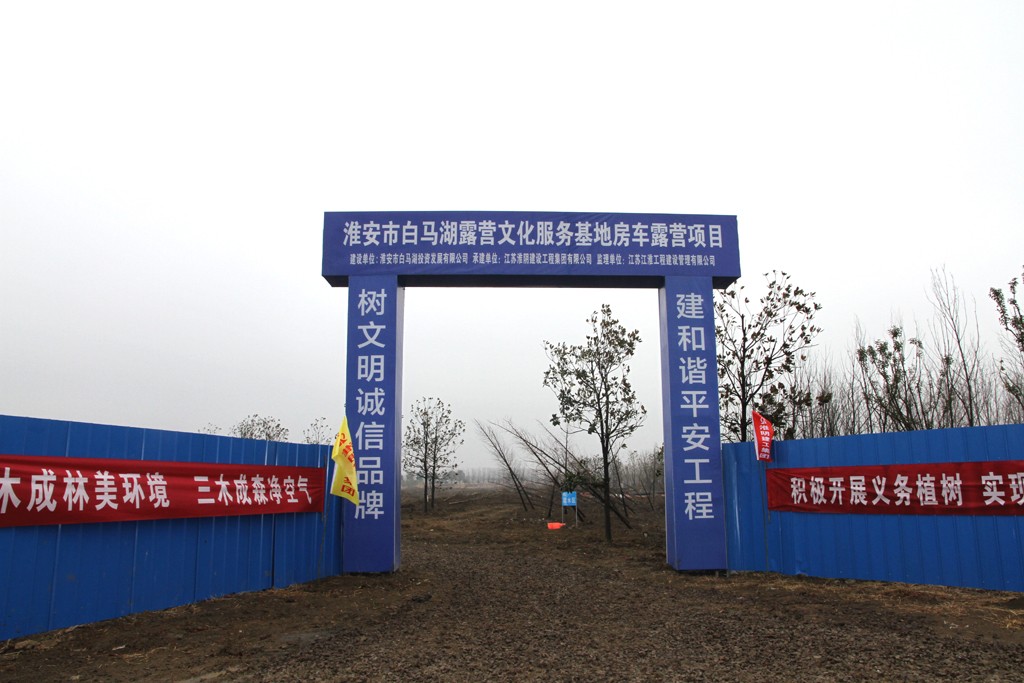 2月28日,必赢(中国)白马湖露营文化服务基地房车露营项目工地彩旗招展,春意盎然。大门两旁悬挂着横幅标语:“积极开展义务植树,实现天蓝水净地绿”,“双木成林美环境,三木成森净空气”。